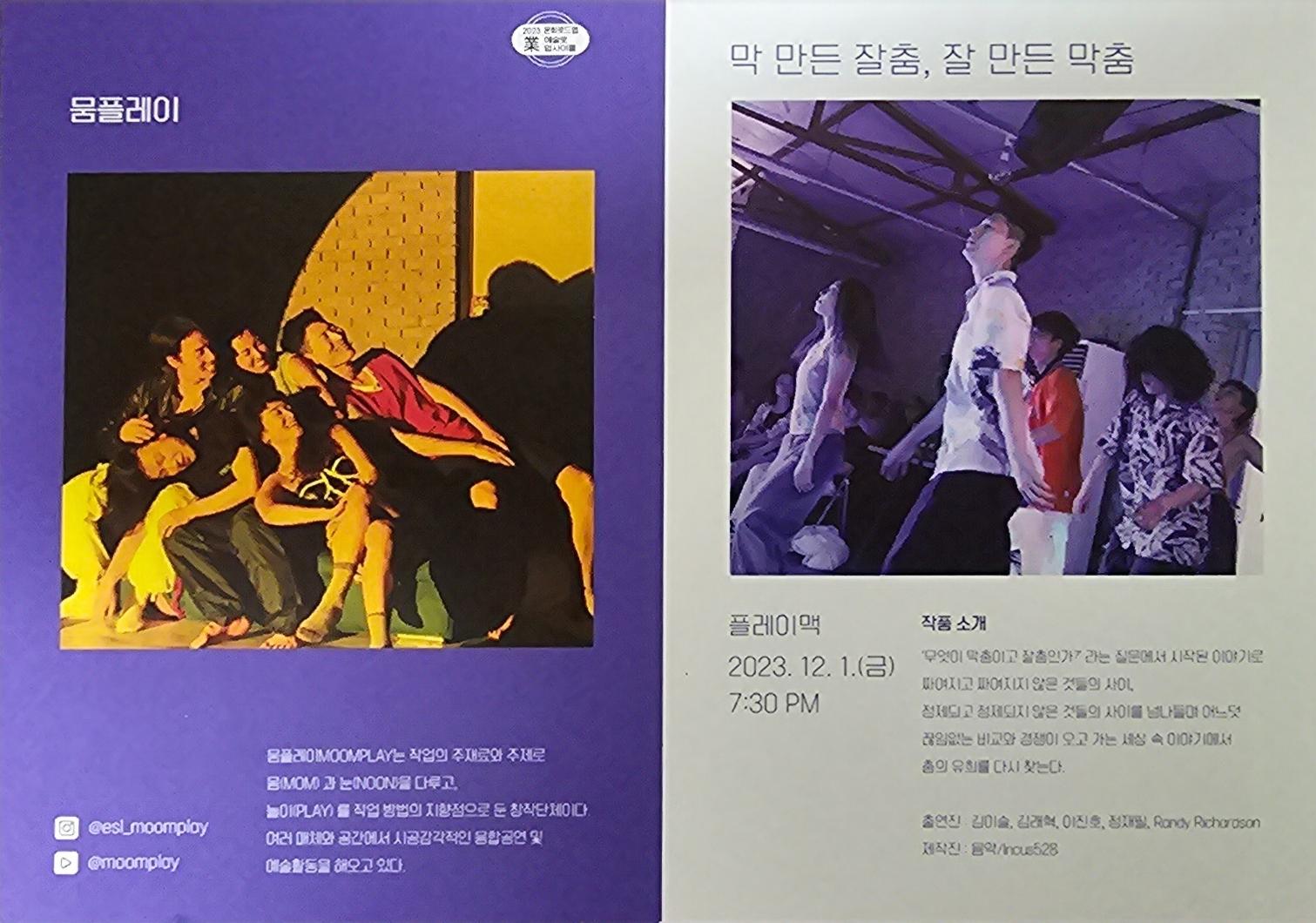 MOOMPLAY는 ‘본다’는 감각에서 출발해 몸과 시선, 그리고 그 사이에서 발생하는 관계와 인식의 방식을 탐구하는 공연예술 기반의 창작 플랫폼이다. 보는 행위가 이루어지는 공간을 무대와 객석의 구분에 한정하지 않고 극장, 갤러리, 도시의 거리, 공공장소, 디지털 환경과 스크린까지 확장하며, 보여주는 이와 보는 이의 역할이 뒤섞이는 지점에서 새로운 수행 경험을 만들어왔다. 장르와 매체의 경계를 두지 않고 현대무용, 장소특정형 작업, 전시와 같은 순수예술의 맥락과 TV, 콘서트, 뮤직비디오, 영상 등 상업예술의 현장을 함께 오가며 작업하고 있으며, 이러한 이중의 실천을 통해 서로 다른 창작 언어와 관객 경험이 만나는 접점을 탐색한다. 몸을 가장 본능적이고 고유한 언어이자 주재료로 삼아 감각의 교환과 선택이 발생하는 탐색의 과정을 이어가며, 그 안에서 생성되는 유희와 긴장을 관객과 함께 경험하고 공유하고자 한다. MOOMPLAY는 하나의 형식이나 스타일로 정의되기보다 예술과 대중, 실험과 소통 사이를 가로지르며 동시대의 감각적 교류와 확장된 공연 경험을 만들어가고자 한다.