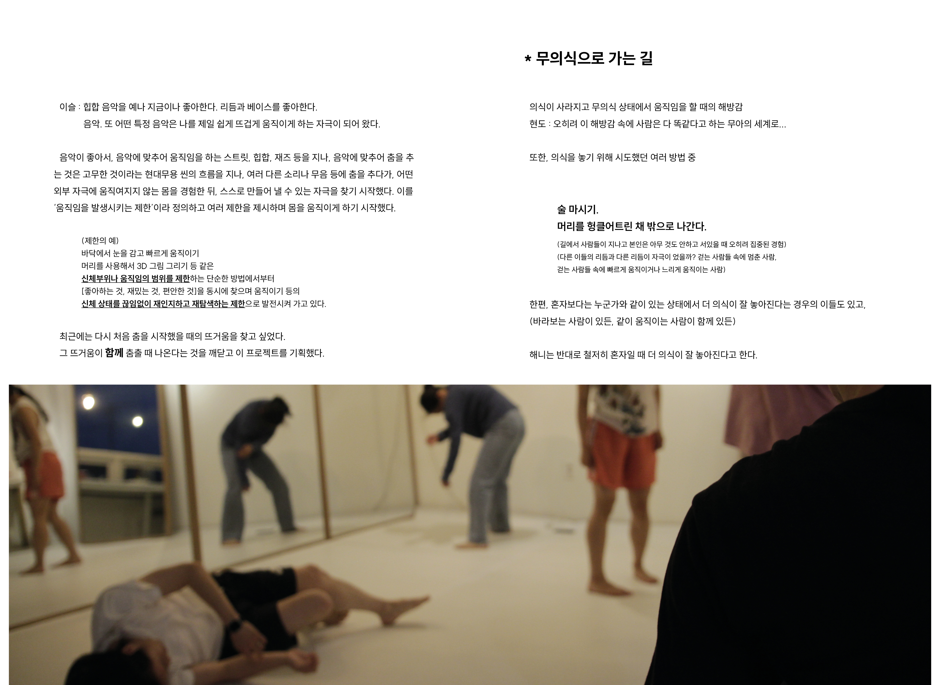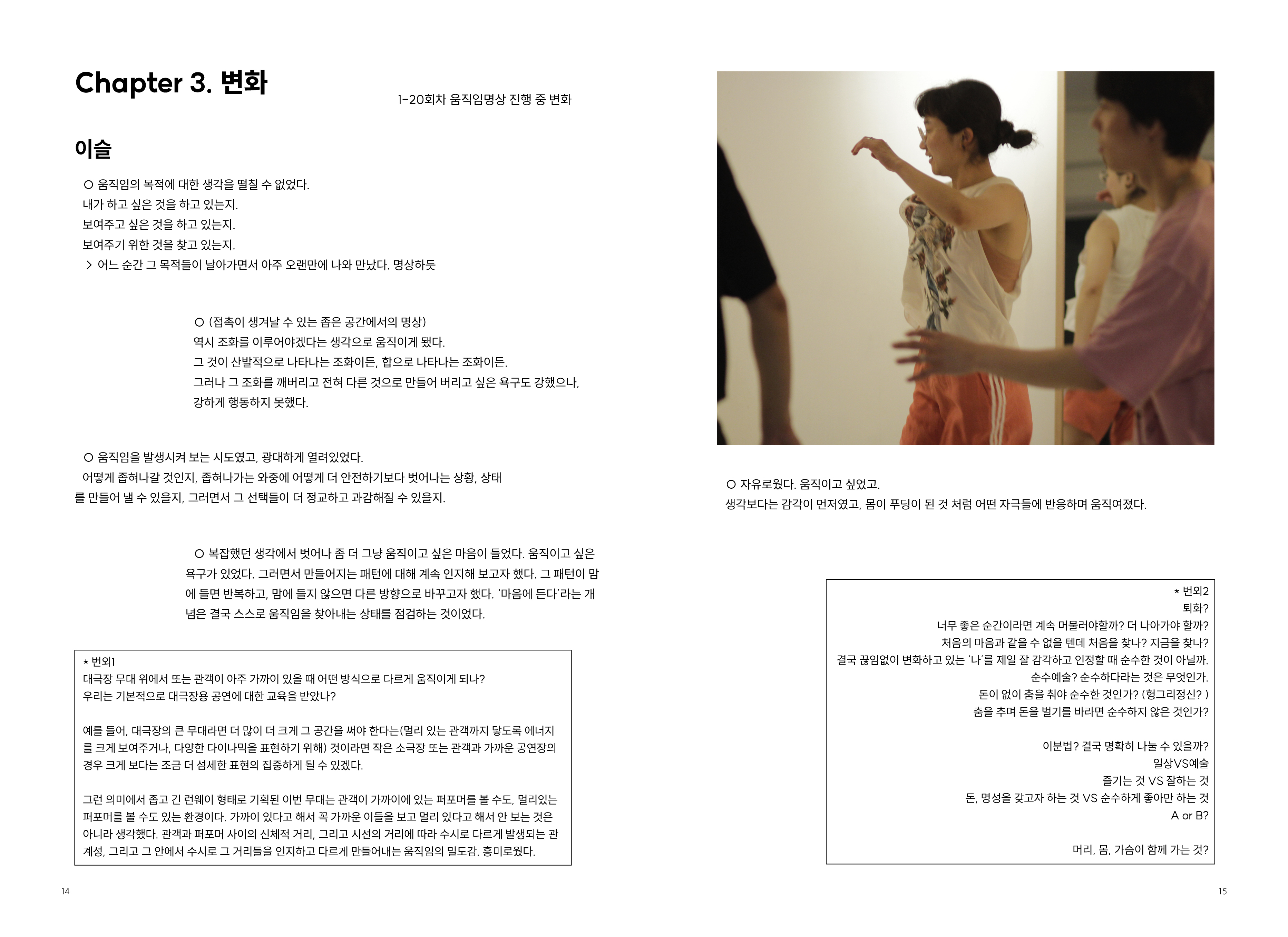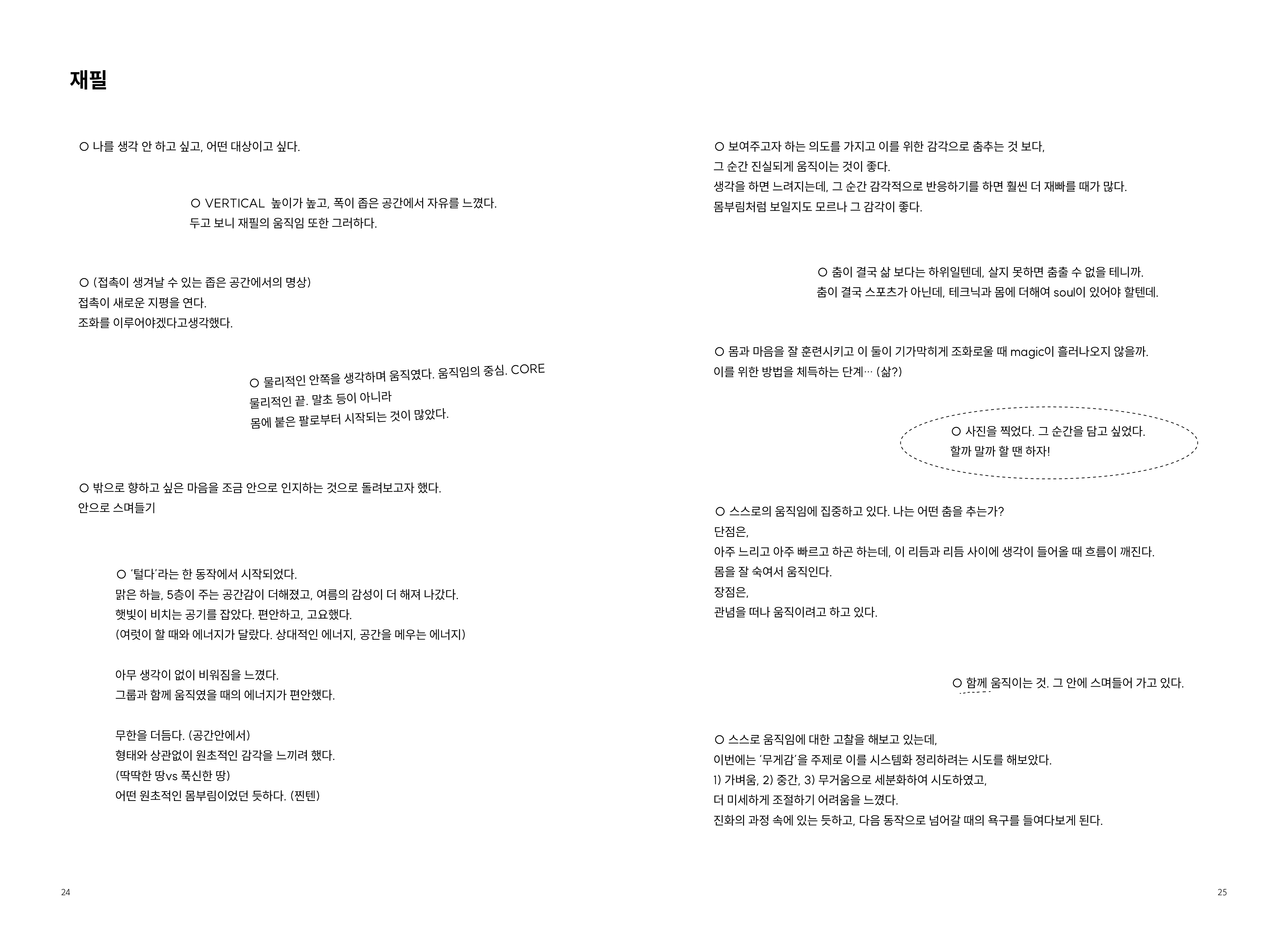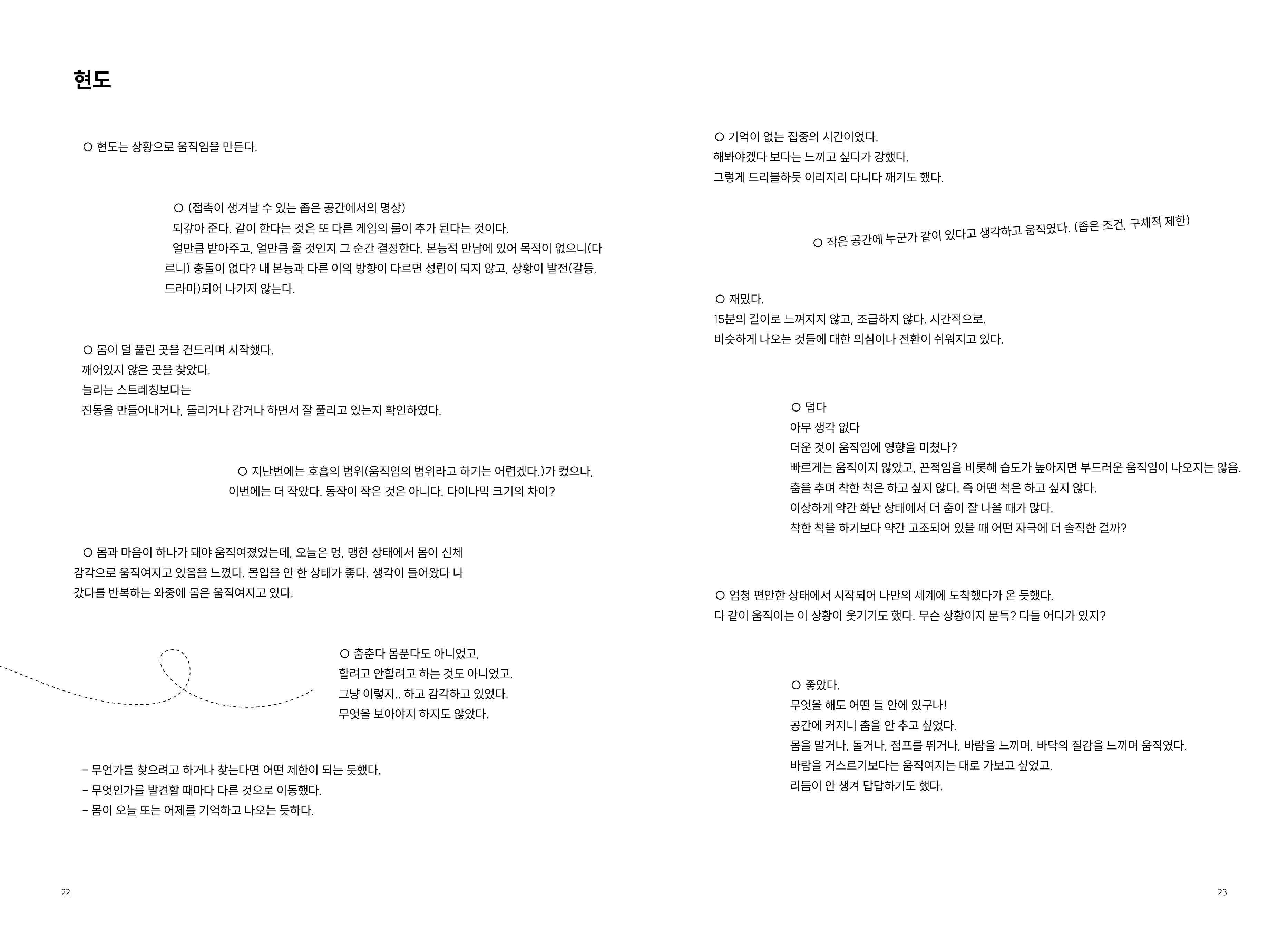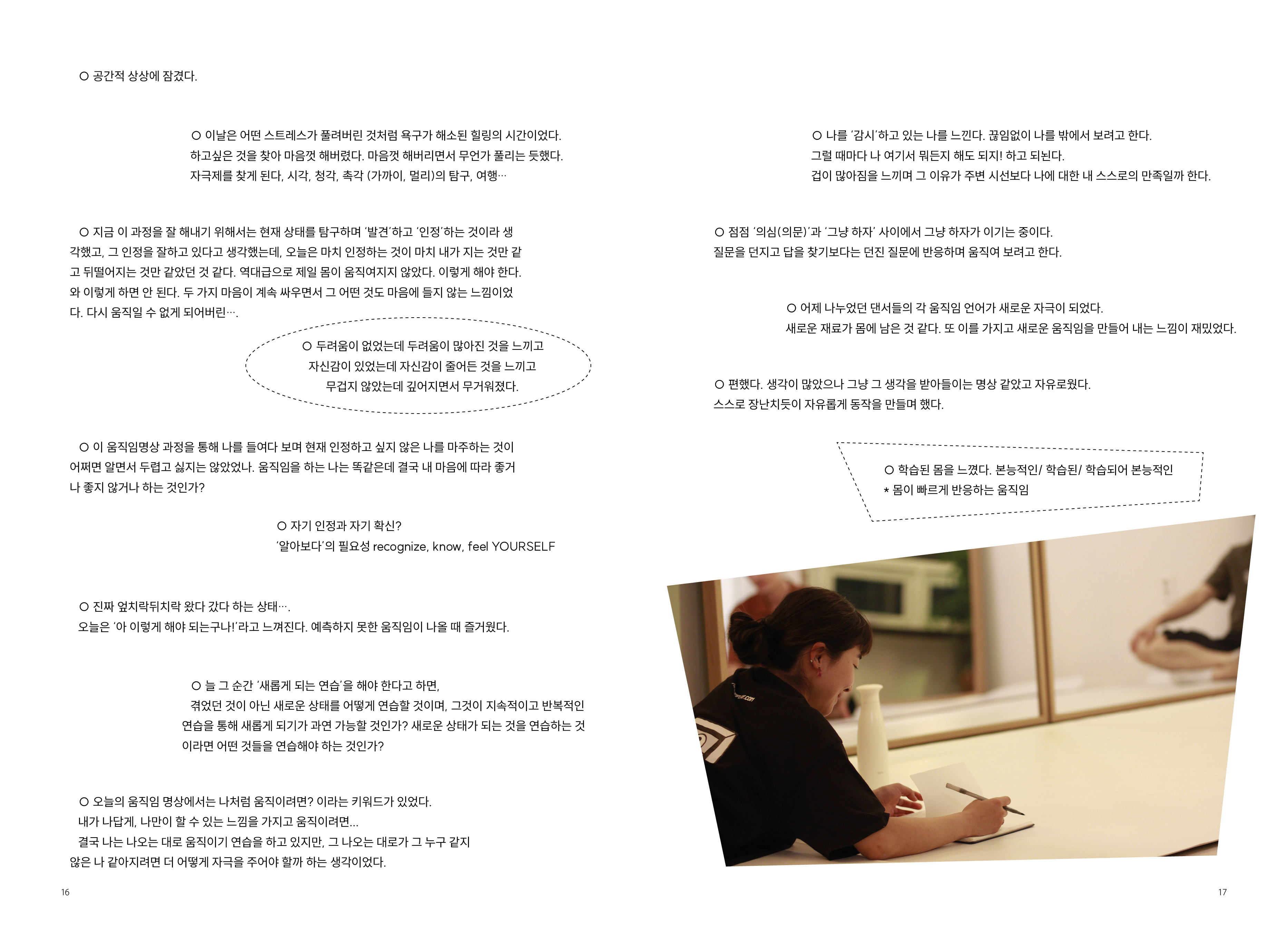 2009년부터 현재까지 작업과정 속의 생각, 경험, 이론 등을 작품활동의 중요 키워드(언어, 몸, 시각, 관객, 공간)로 나누어 정리해 나가는 글 모음들 입니다.