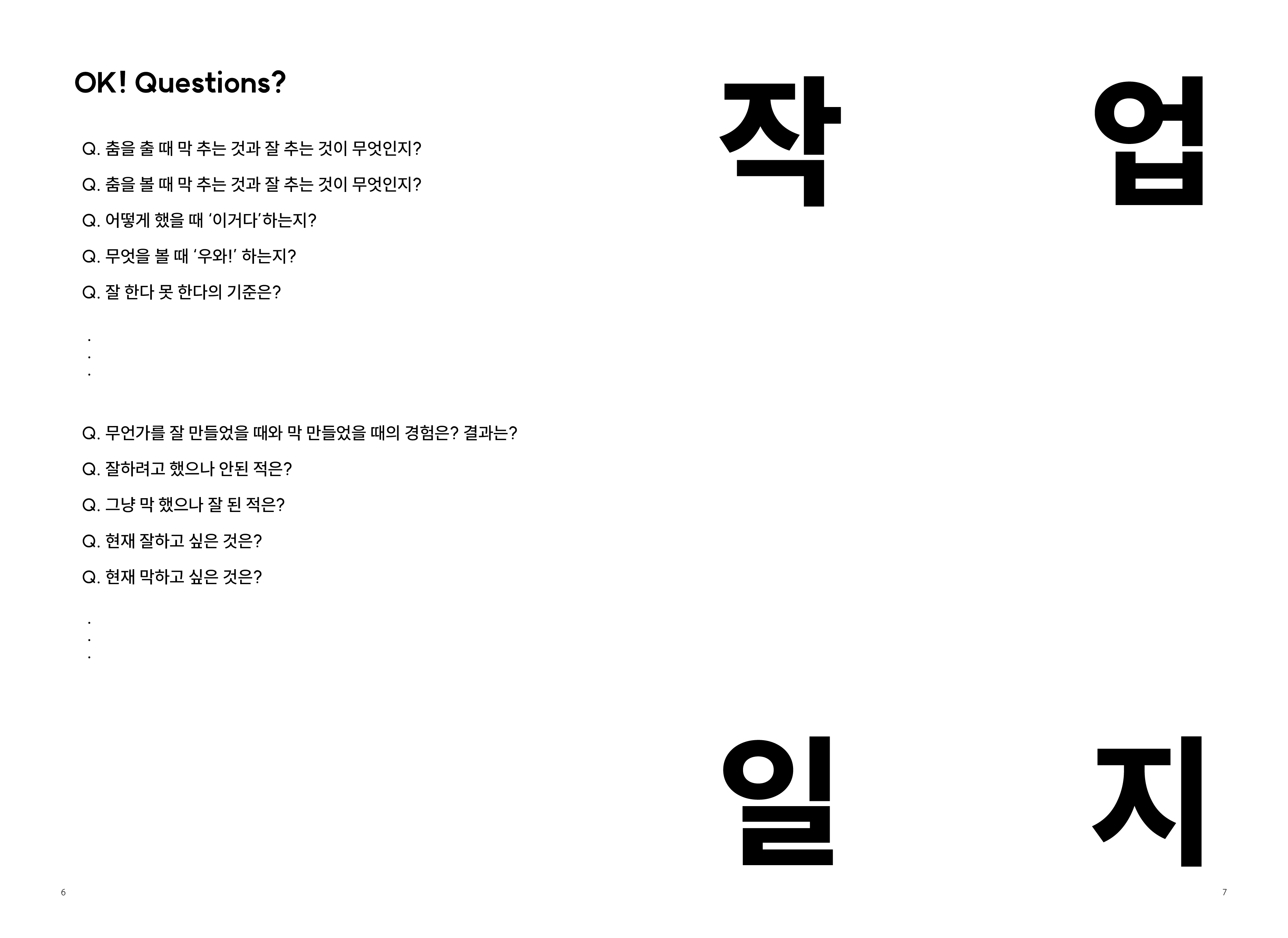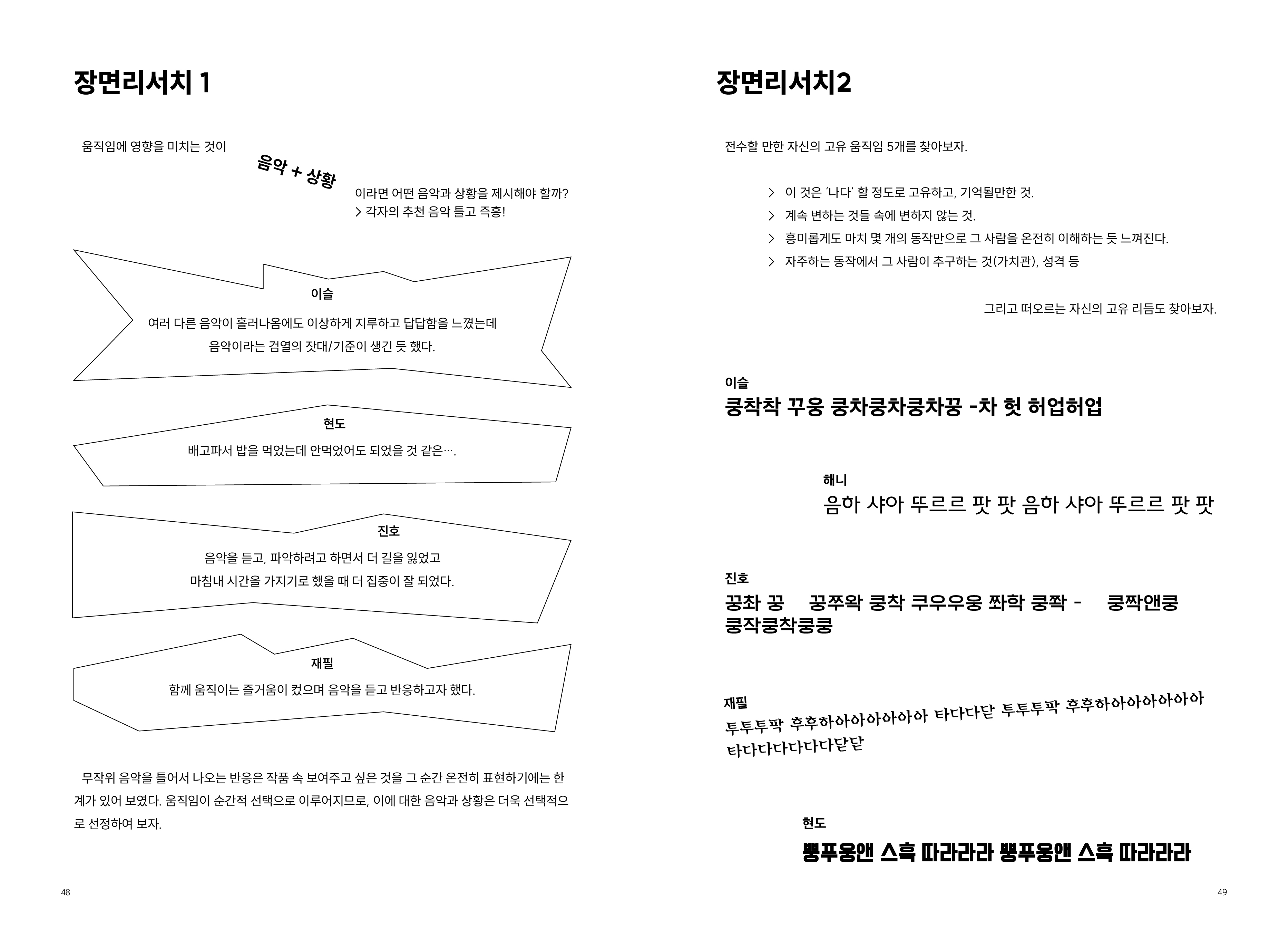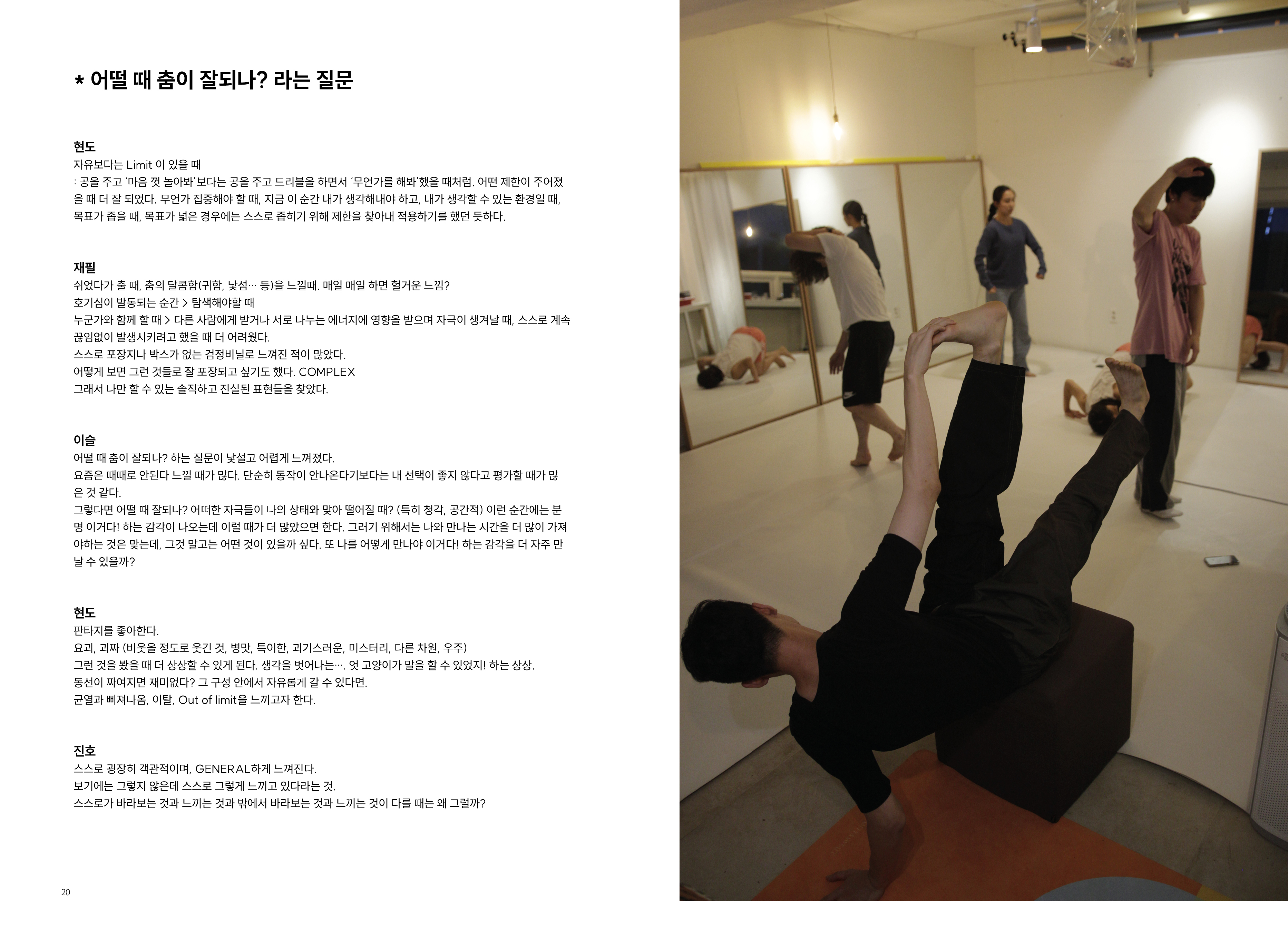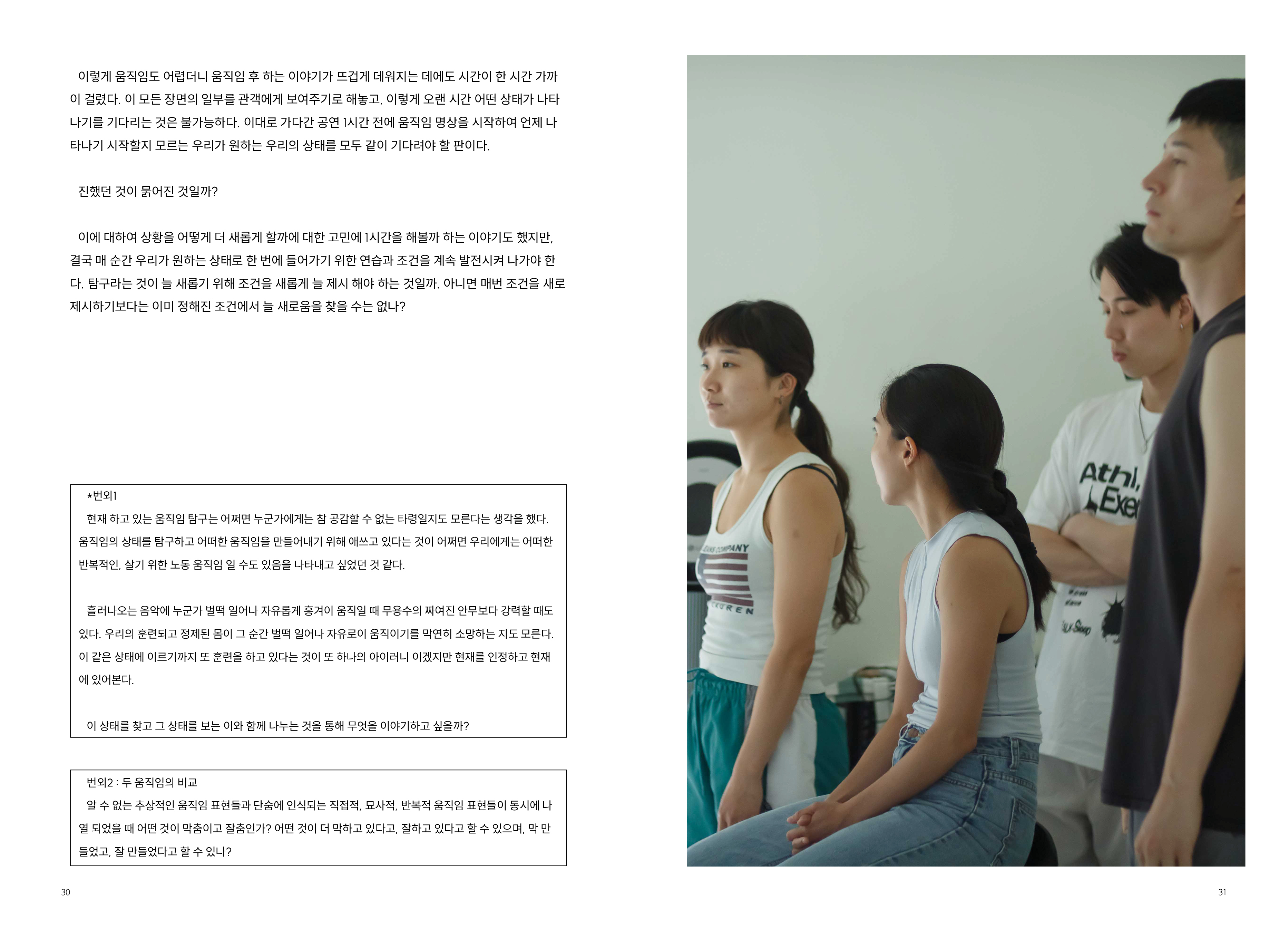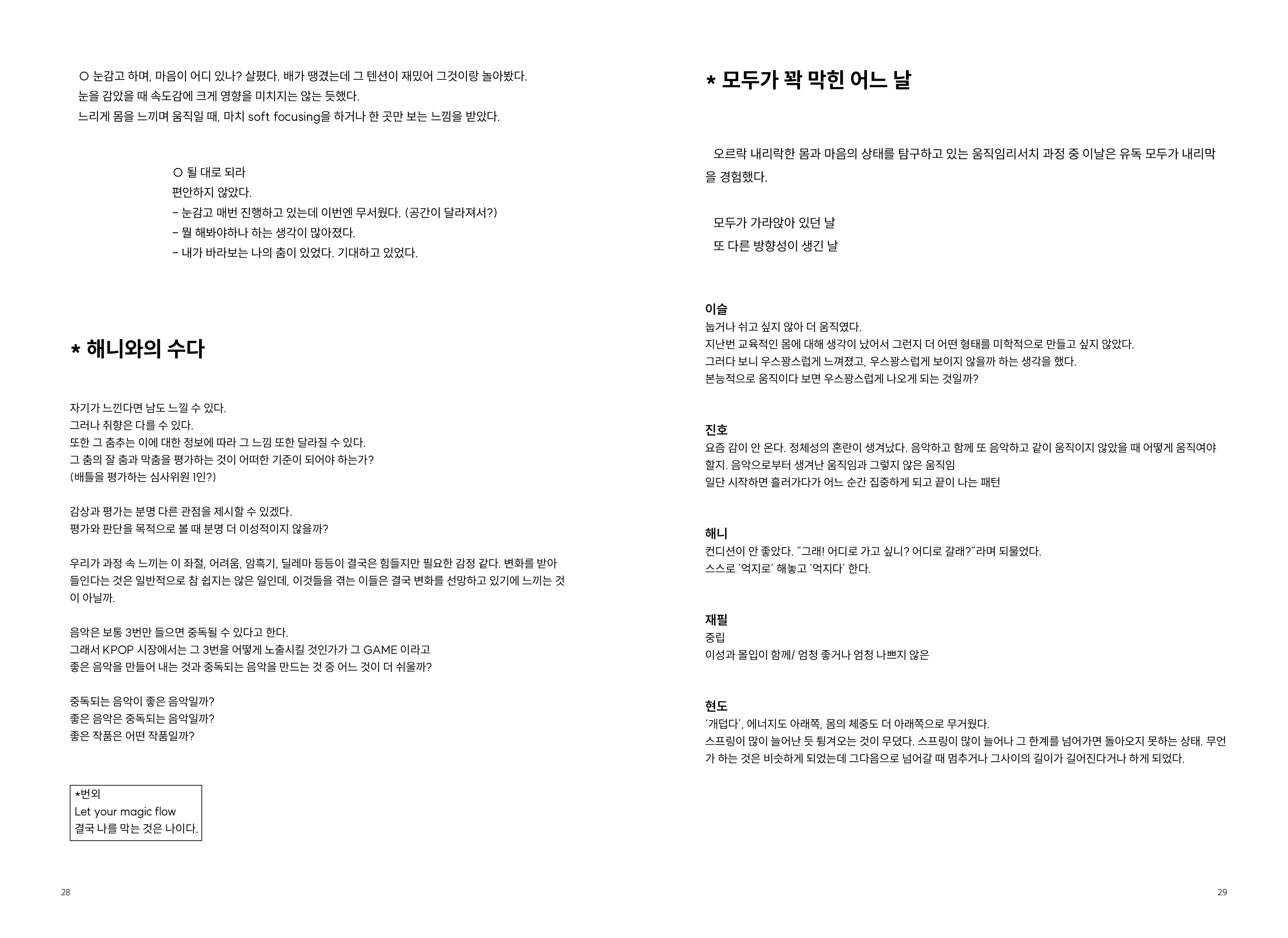 2009년부터 현재까지 작업과정 속의 생각, 경험, 이론 등을 작품활동의 중요 키워드(언어, 몸, 시각, 관객, 공간)로 나누어 정리해 나가는 글 모음들 입니다.