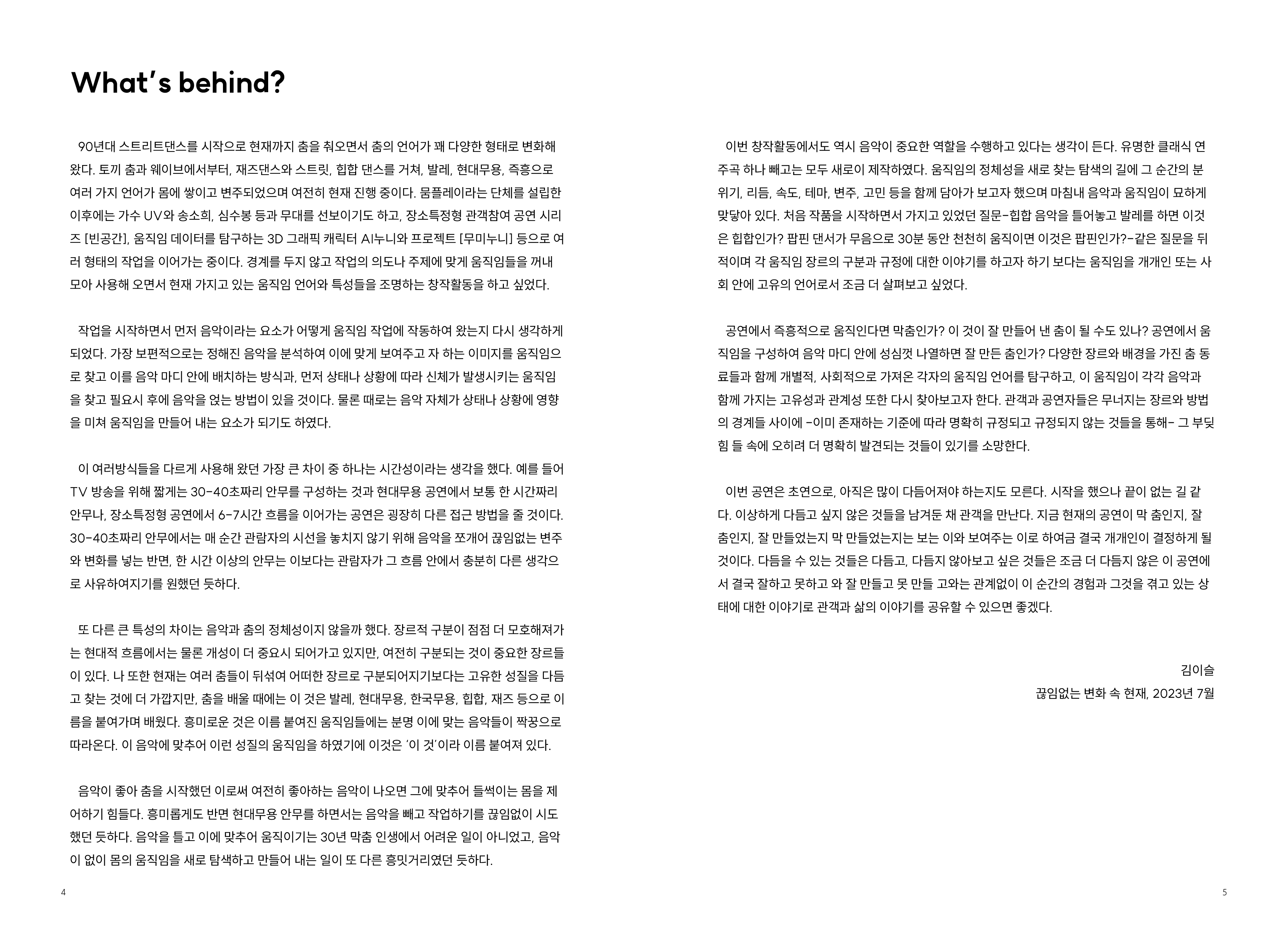 김이슬은 움직임을 매개로 작업하는 공연예술가이자 창작자, 교육자, 그리고 협업의 구조를 설계하는 디렉터이다. 다양한 움직임 언어를 기반으로 국내외 여러 무대에 서온 그는 현재까지도 강한 신체성과 감각적 존재감을 지닌 퍼포머로 활동하는 동시에, 안무가로서 공연예술과 대중예술의 폭넓은 플랫폼을 오가며 작업하고 있다. 무용 작품뿐 아니라 콘서트, 방송, 뮤직비디오, 뮤지컬, 연극 등 서로 다른 환경 속에서 몸이 작동하는 방식을 탐구하며 장르와 매체에 제한되지 않는 창작을 이어가고, 각기 다른 분야의 예술가들과 협업하며 인간의 신체가 표현하는 다양한 가능성을 탐색한다. 또한 교육자로서 움직임을 기술이 아닌 개인의 감각과 인식을 확장하는 언어로 다루며, 참여자들이 자신의 몸을 통해 사고하고 표현하는 경험의 장을 구축해왔다. 이러한 다층적인 실천은 무대와 현장, 예술과 대중의 사이를 이으며 동시대 움직임의 가능성을 탐색하는 그의 작업 전반을 형성하고 있다. 국립아시아문화전당 안무가랩, 서울문화재단 창작활동지원, 한국예술창작아카데미, 국립현대무용단 안무랩, 영국 The Place Touchwood, 생생페스티벌, PADAF, 안산국제거리극축제 등 다양한 창작 플랫폼에서 작업을 발표해왔으며, 단체 뭄플레이의 기획공연, 프로젝트 또한 꾸준히 선보이고 있다. 미국, 캐나다, 오스트리아, 브라질, 프랑스, 독일, 멕시코 등 여러 국가에서 퍼포머로 활동하며 국제적인 현장 경험을 축적했고, 서울무용센터, 국립아시아문화전당, 캐나다 오타와 댄스 디렉티브, 독일 함부르크 K3, 영국 런던 더플레이스 등 국내외 레지던시에 참여했다.