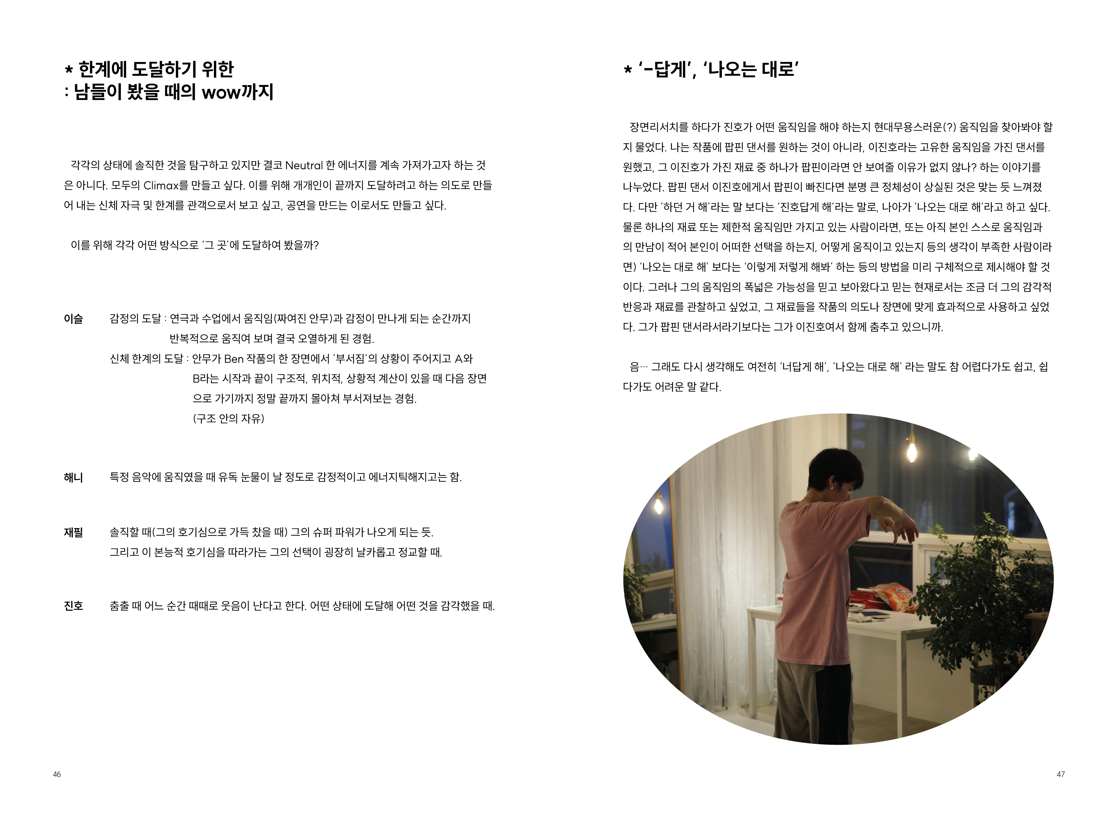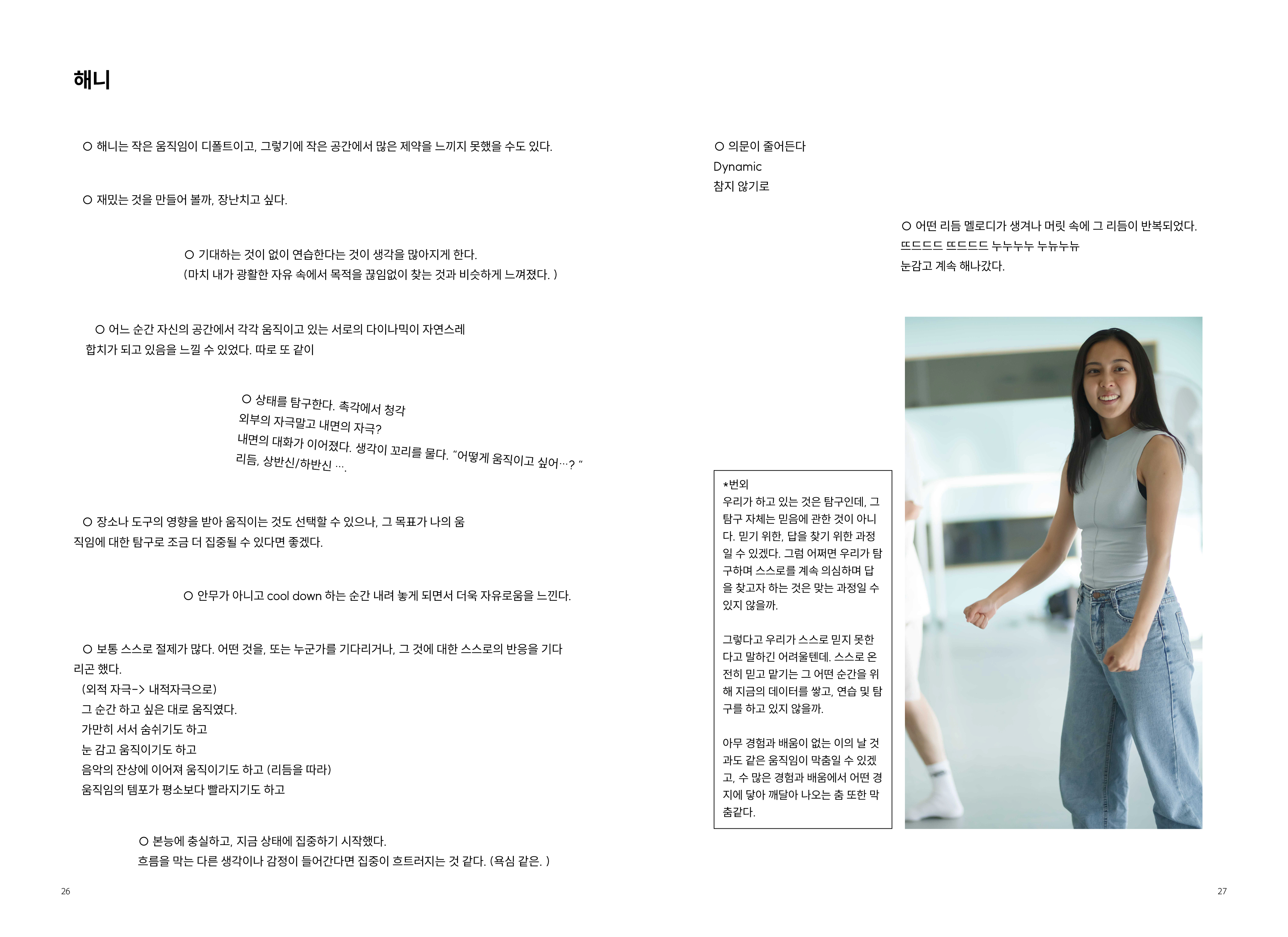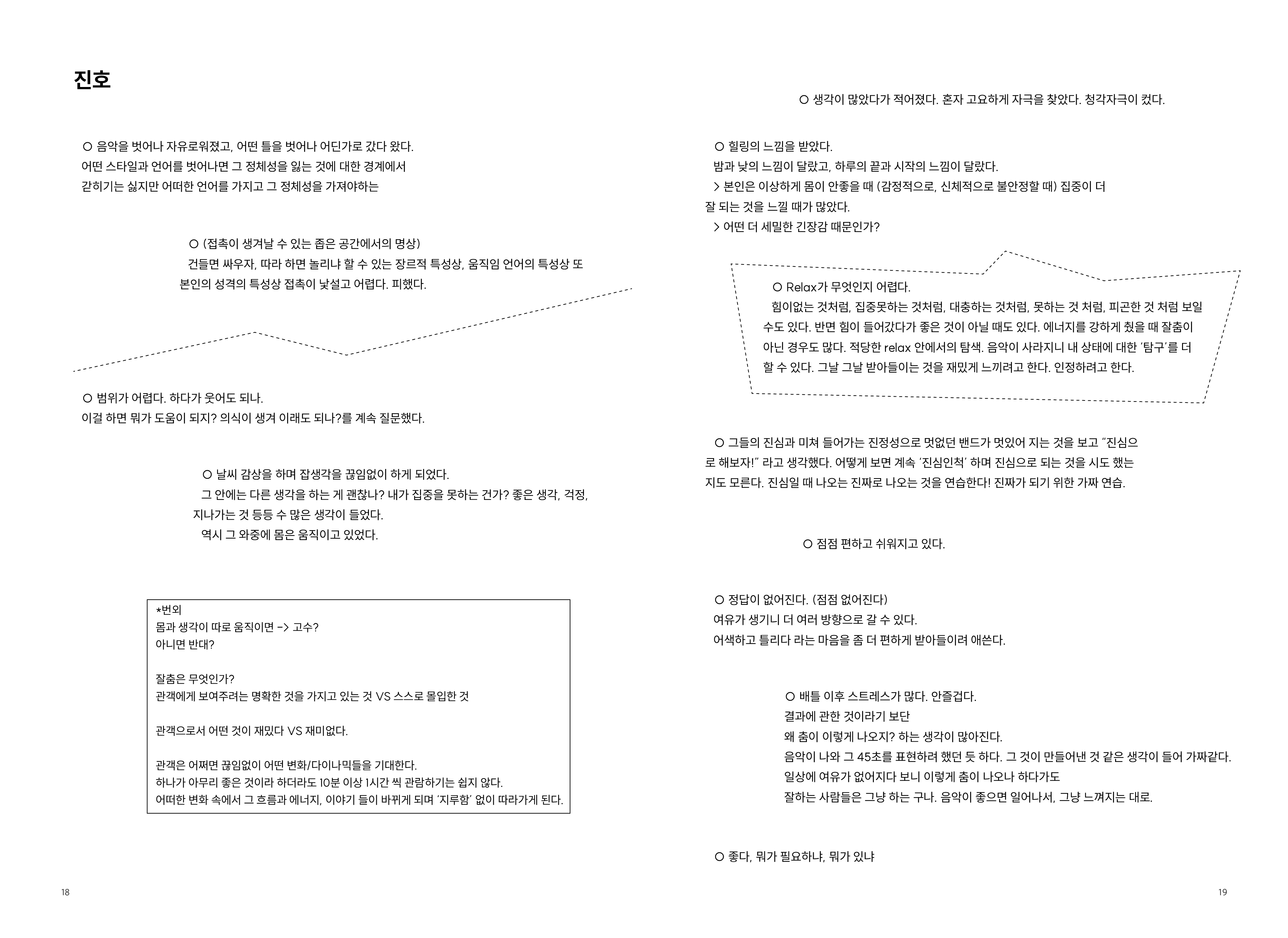 2009년부터 현재까지 작업과정 속의 생각, 경험, 이론 등을 작품활동의 중요 키워드(언어, 몸, 시각, 관객, 공간)로 나누어 정리해 나가는 글 모음들 입니다.