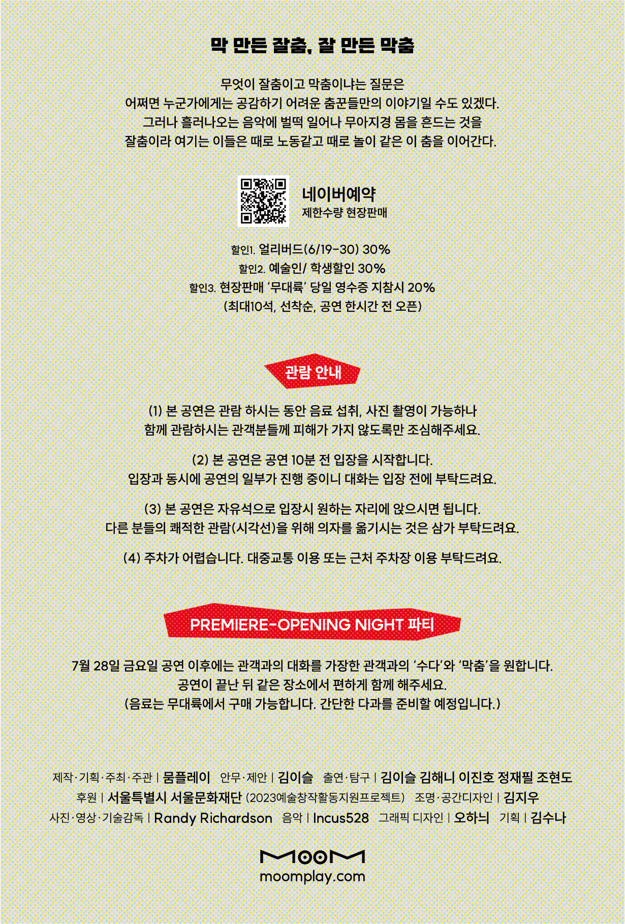 MOOMPLAY는 ‘본다’는 감각에서 출발해 몸과 시선, 그리고 그 사이에서 발생하는 관계와 인식의 방식을 탐구하는 공연예술 기반의 창작 플랫폼이다. 보는 행위가 이루어지는 공간을 무대와 객석의 구분에 한정하지 않고 극장, 갤러리, 도시의 거리, 공공장소, 디지털 환경과 스크린까지 확장하며, 보여주는 이와 보는 이의 역할이 뒤섞이는 지점에서 새로운 수행 경험을 만들어왔다. 장르와 매체의 경계를 두지 않고 현대무용, 장소특정형 작업, 전시와 같은 순수예술의 맥락과 TV, 콘서트, 뮤직비디오, 영상 등 상업예술의 현장을 함께 오가며 작업하고 있으며, 이러한 이중의 실천을 통해 서로 다른 창작 언어와 관객 경험이 만나는 접점을 탐색한다. 몸을 가장 본능적이고 고유한 언어이자 주재료로 삼아 감각의 교환과 선택이 발생하는 탐색의 과정을 이어가며, 그 안에서 생성되는 유희와 긴장을 관객과 함께 경험하고 공유하고자 한다. MOOMPLAY는 하나의 형식이나 스타일로 정의되기보다 예술과 대중, 실험과 소통 사이를 가로지르며 동시대의 감각적 교류와 확장된 공연 경험을 만들어가고자 한다.