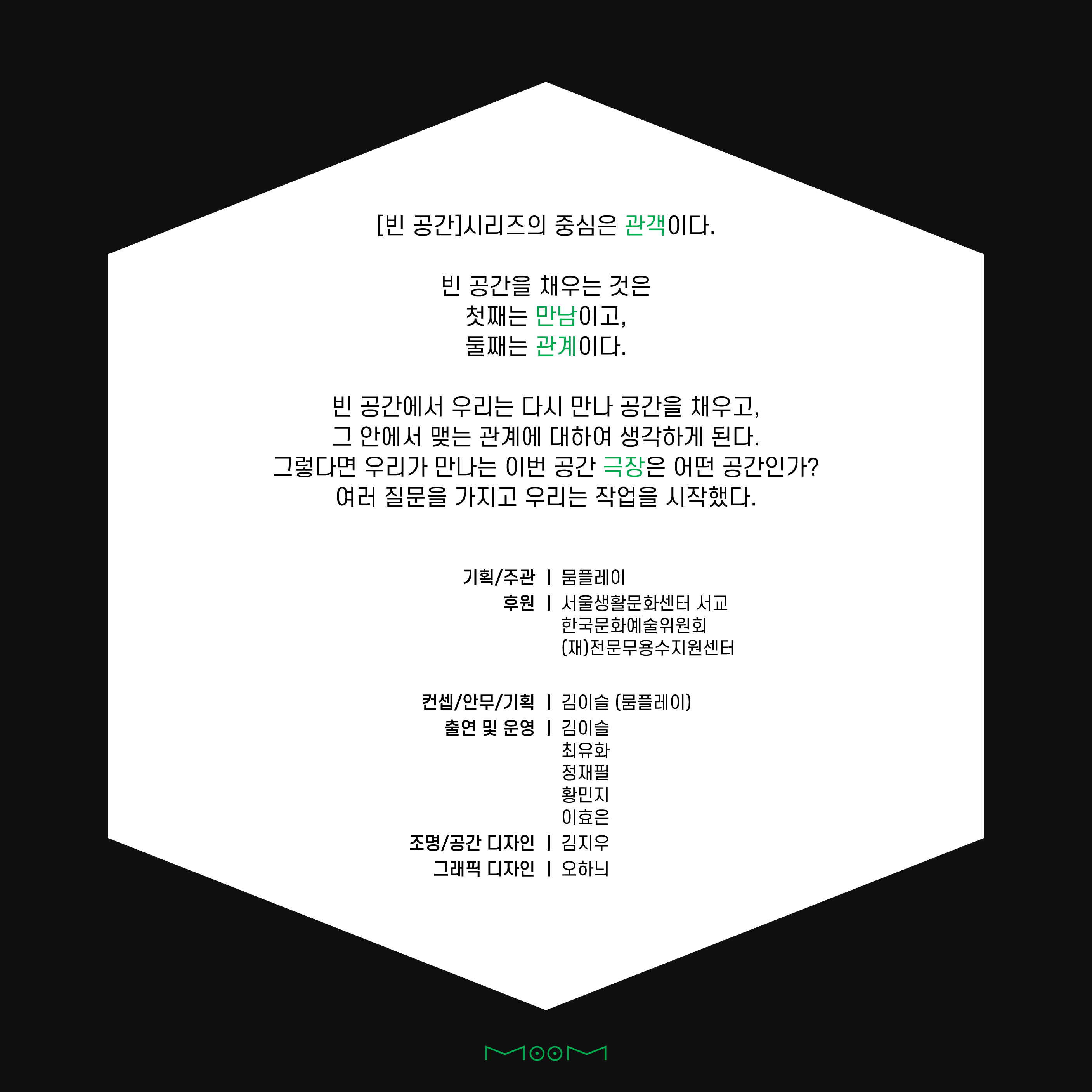 MOOMPLAY는 ‘본다’는 감각에서 출발해 몸과 시선, 그리고 그 사이에서 발생하는 관계와 인식의 방식을 탐구하는 공연예술 기반의 창작 플랫폼이다. 보는 행위가 이루어지는 공간을 무대와 객석의 구분에 한정하지 않고 극장, 갤러리, 도시의 거리, 공공장소, 디지털 환경과 스크린까지 확장하며, 보여주는 이와 보는 이의 역할이 뒤섞이는 지점에서 새로운 수행 경험을 만들어왔다. 장르와 매체의 경계를 두지 않고 현대무용, 장소특정형 작업, 전시와 같은 순수예술의 맥락과 TV, 콘서트, 뮤직비디오, 영상 등 상업예술의 현장을 함께 오가며 작업하고 있으며, 이러한 이중의 실천을 통해 서로 다른 창작 언어와 관객 경험이 만나는 접점을 탐색한다. 몸을 가장 본능적이고 고유한 언어이자 주재료로 삼아 감각의 교환과 선택이 발생하는 탐색의 과정을 이어가며, 그 안에서 생성되는 유희와 긴장을 관객과 함께 경험하고 공유하고자 한다. MOOMPLAY는 하나의 형식이나 스타일로 정의되기보다 예술과 대중, 실험과 소통 사이를 가로지르며 동시대의 감각적 교류와 확장된 공연 경험을 만들어가고자 한다.
