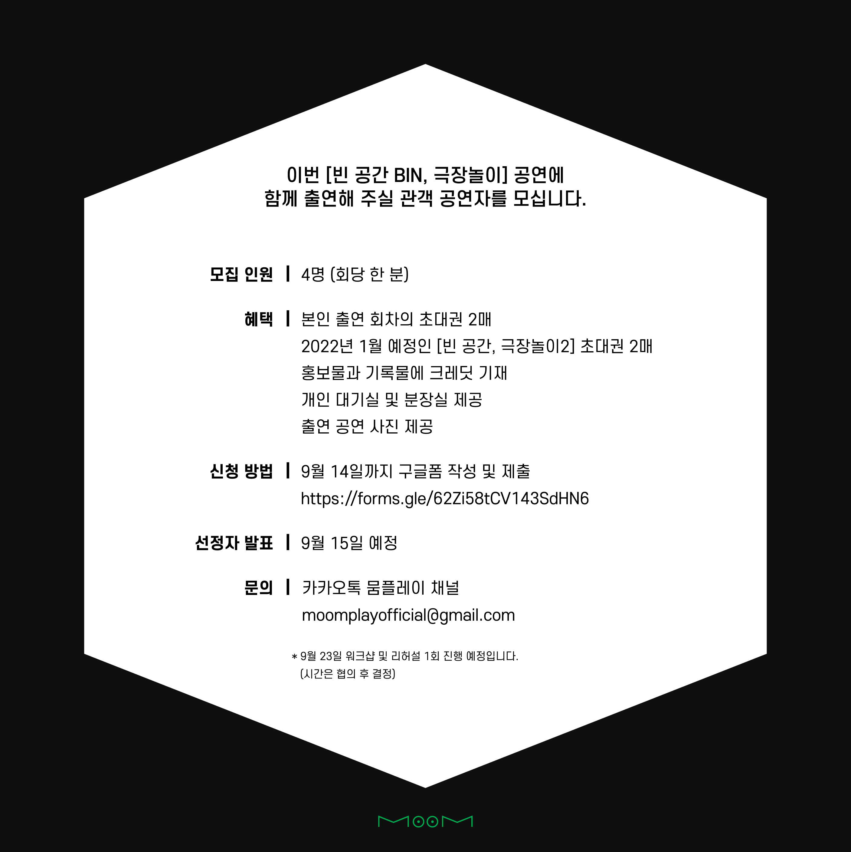 MOOMPLAY는 ‘본다’는 감각에서 출발해 몸과 시선, 그리고 그 사이에서 발생하는 관계와 인식의 방식을 탐구하는 공연예술 기반의 창작 플랫폼이다. 보는 행위가 이루어지는 공간을 무대와 객석의 구분에 한정하지 않고 극장, 갤러리, 도시의 거리, 공공장소, 디지털 환경과 스크린까지 확장하며, 보여주는 이와 보는 이의 역할이 뒤섞이는 지점에서 새로운 수행 경험을 만들어왔다. 장르와 매체의 경계를 두지 않고 현대무용, 장소특정형 작업, 전시와 같은 순수예술의 맥락과 TV, 콘서트, 뮤직비디오, 영상 등 상업예술의 현장을 함께 오가며 작업하고 있으며, 이러한 이중의 실천을 통해 서로 다른 창작 언어와 관객 경험이 만나는 접점을 탐색한다. 몸을 가장 본능적이고 고유한 언어이자 주재료로 삼아 감각의 교환과 선택이 발생하는 탐색의 과정을 이어가며, 그 안에서 생성되는 유희와 긴장을 관객과 함께 경험하고 공유하고자 한다. MOOMPLAY는 하나의 형식이나 스타일로 정의되기보다 예술과 대중, 실험과 소통 사이를 가로지르며 동시대의 감각적 교류와 확장된 공연 경험을 만들어가고자 한다.