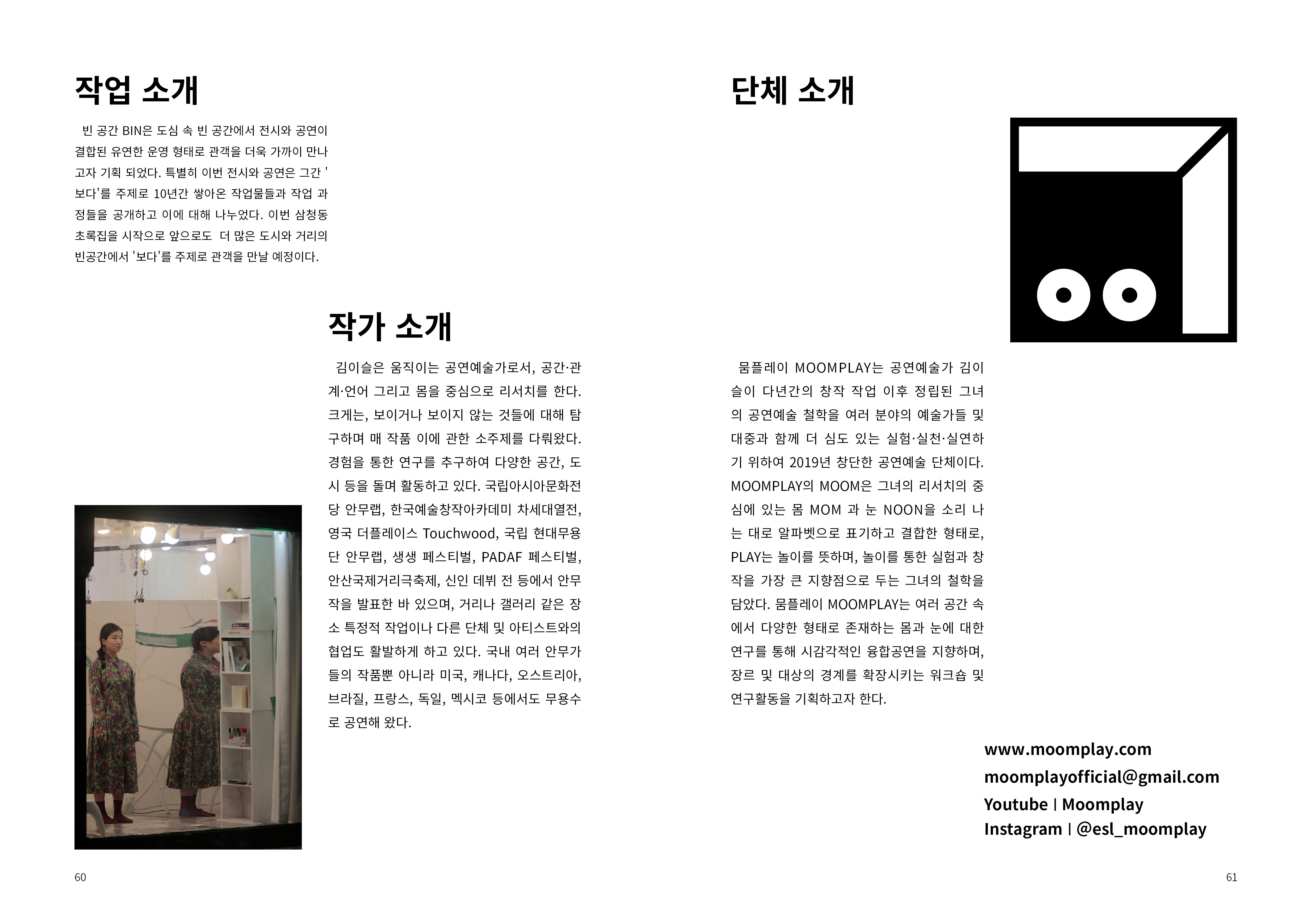 MOOMPLAY는 ‘본다’는 감각에서 출발해 몸과 시선, 그리고 그 사이에서 발생하는 관계와 인식의 방식을 탐구하는 공연예술 기반의 창작 플랫폼이다. 보는 행위가 이루어지는 공간을 무대와 객석의 구분에 한정하지 않고 극장, 갤러리, 도시의 거리, 공공장소, 디지털 환경과 스크린까지 확장하며, 보여주는 이와 보는 이의 역할이 뒤섞이는 지점에서 새로운 수행 경험을 만들어왔다. 장르와 매체의 경계를 두지 않고 현대무용, 장소특정형 작업, 전시와 같은 순수예술의 맥락과 TV, 콘서트, 뮤직비디오, 영상 등 상업예술의 현장을 함께 오가며 작업하고 있으며, 이러한 이중의 실천을 통해 서로 다른 창작 언어와 관객 경험이 만나는 접점을 탐색한다. 몸을 가장 본능적이고 고유한 언어이자 주재료로 삼아 감각의 교환과 선택이 발생하는 탐색의 과정을 이어가며, 그 안에서 생성되는 유희와 긴장을 관객과 함께 경험하고 공유하고자 한다. MOOMPLAY는 하나의 형식이나 스타일로 정의되기보다 예술과 대중, 실험과 소통 사이를 가로지르며 동시대의 감각적 교류와 확장된 공연 경험을 만들어가고자 한다.