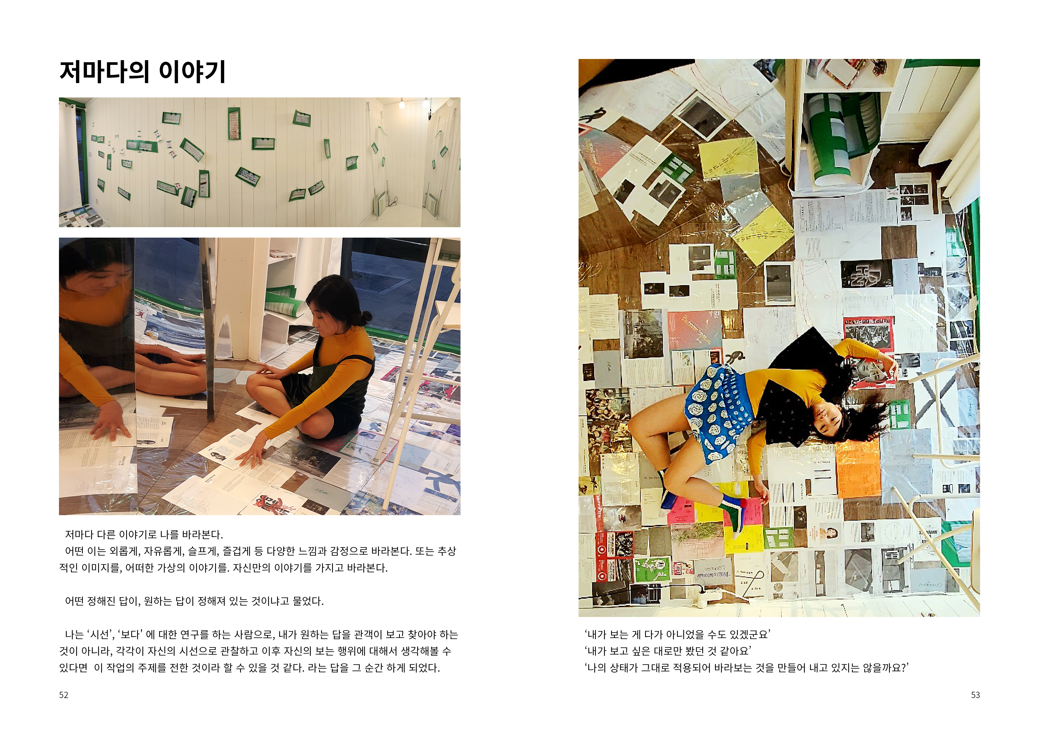 2009년부터 현재까지 작업과정 속의 생각, 경험, 이론 등을 작품활동의 중요 키워드(언어, 몸, 시각, 관객, 공간)로 나누어 정리해 나가는 글 모음들 입니다.