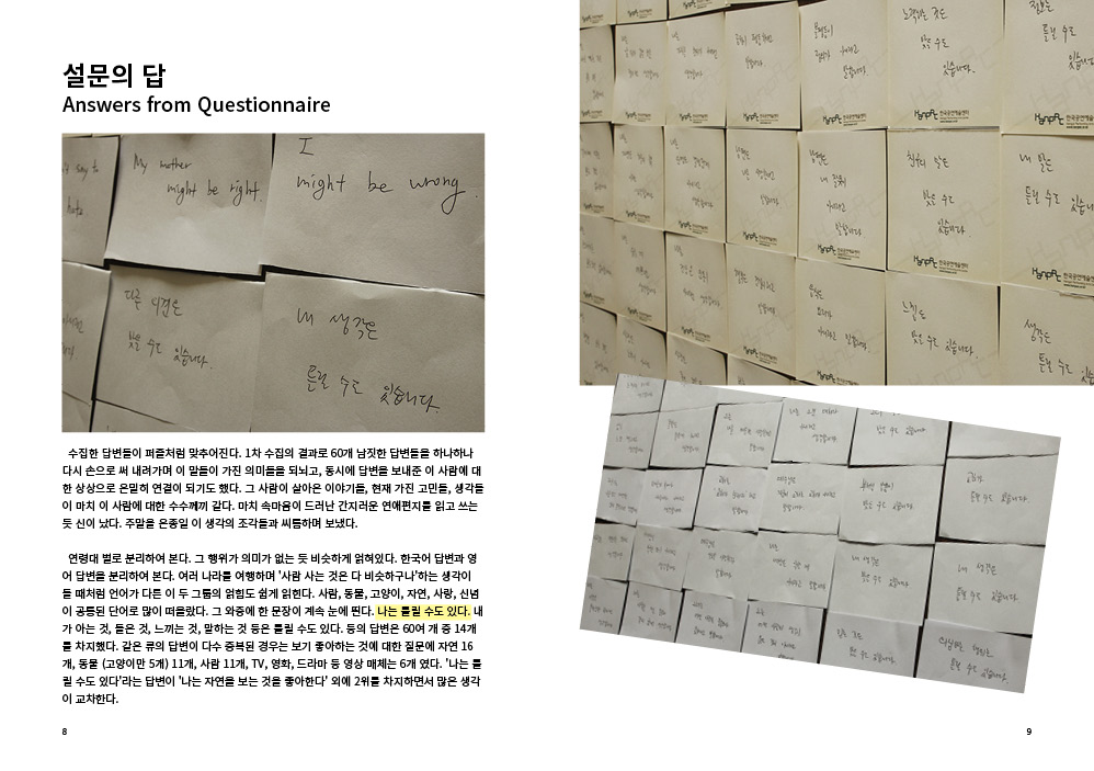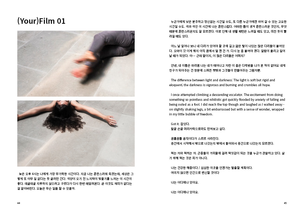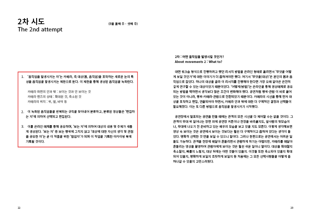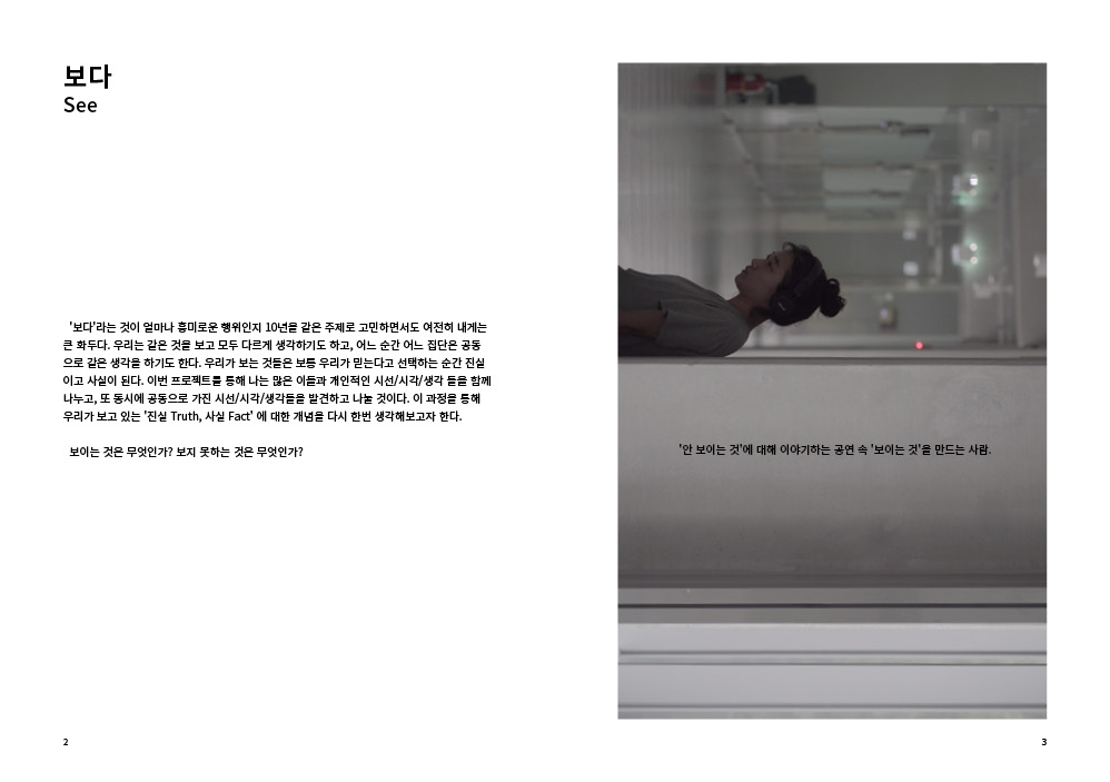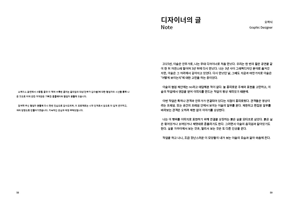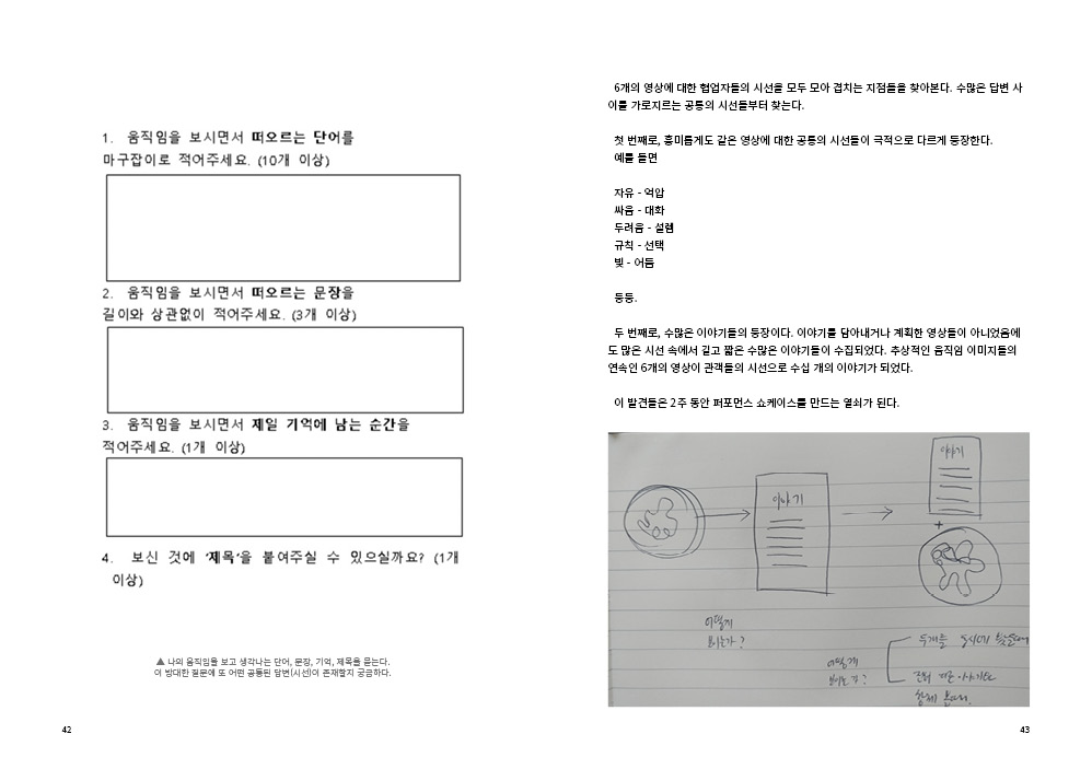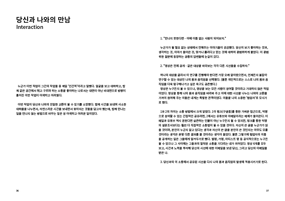 2009년부터 현재까지 작업과정 속의 생각, 경험, 이론 등을 작품활동의 중요 키워드(언어, 몸, 시각, 관객, 공간)로 나누어 정리해 나가는 글 모음들 입니다.