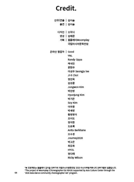 Choreographer, Artistic Director and founder of the creative group MOOMPLAY, Esl Kim has a diverse performance and dance background; ranging from street to modern. Over the past 17 years she has worked with numerous local and international choreographers with many differing body movement methodologies; Marcos Morau(Spain), Ben J. Riepe(Germany), Ismael Ivo(Brazil), Hiroaki Umeda(Japan), Rosie Herrera(United States), Sarah Doucet(Canada), Jinyeob Cha(Korea), to name a few. Living and traveling in several foreign countries with various cultures has allowed her develop her abilities while expanding her artistic perspectives. The primary theme of her work over the last 12 years has been focused on perception; particularly the limits of sight and understanding through the relationship of words and movements as well as the blurring of space and boundaries between spectator and performer. Works based on this theme have been presented since 2014; at the Korea National Contemporary Dance Company's 'CHOREO LAB', Asia Culture Center' 'Choreographer's LAB, PADAF, Ansan International Street Arts Festival and numerous projects and residencies; Ottawa Dance Directive- Ottawa (2021), Choreodrome-London(2018),K3-Hamburg(2017).