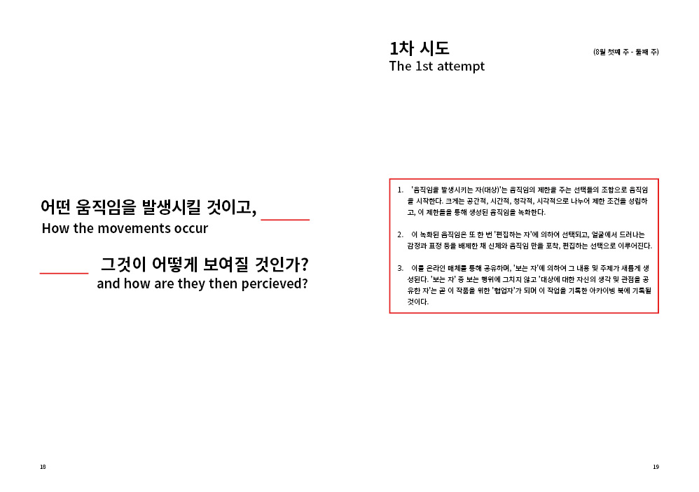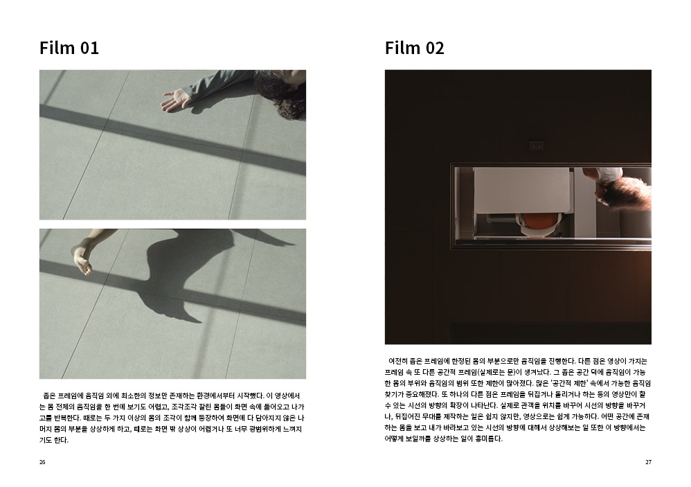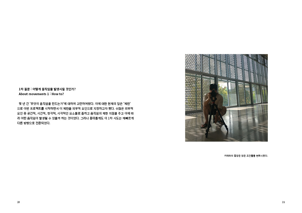 Living and traveling in several foreign countries with various cultures has allowed her develop her abilities while expanding her artistic perspectives. The primary theme of her work over the last 12 years has been focused on perception; particularly the limits of sight and understanding through the relationship of words and movements as well as the blurring of space and boundaries between spectator and performer. Works based on this theme have been presented since 2014; at the Korea National Contemporary Dance Company's 'CHOREO LAB', Asia Culture Center' 'Choreographer's LAB, PADAF, Ansan International Street Arts Festival and numerous projects and residencies; Ottawa Dance Directive- Ottawa (2021), Choreodrome-London(2018),K3-Hamburg(2017).