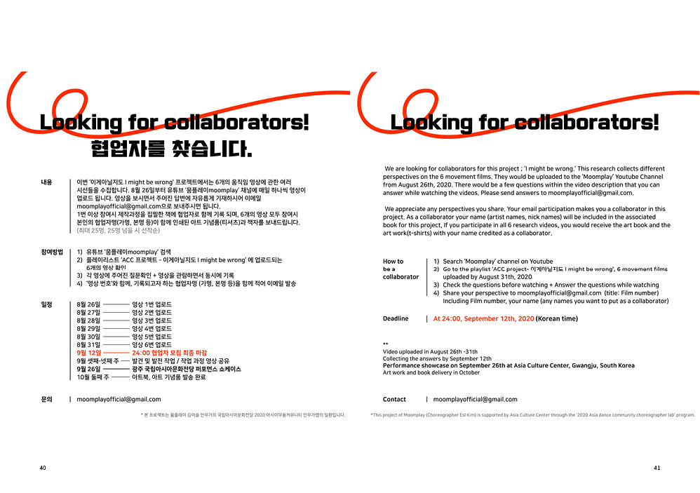 MOOMPLAY is an experimental performance group founded by Esl Kim in 2019. The name MOOMPLAY is derived from the Korean words 몸 (mom), meaning body, and 눈 (noon), meaning eye or sight. Through observation, investigation, experimentation, and exploration, MOOMPLAY playfully and inquisitively engages the body, perception, and consciousness as ways of expanding how the observer/performer experiences and understands the world. Its projects unfold across diverse contexts—from contemporary performance and site-specific work to collaborations in media, concerts, and visual formats.