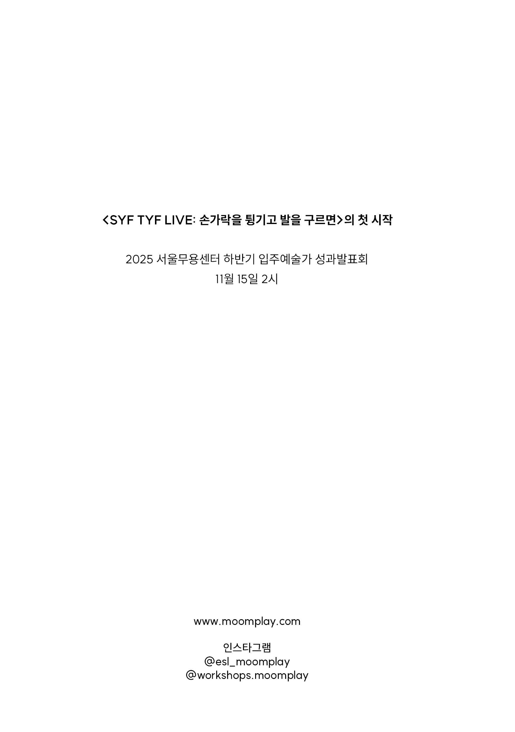 MOOMPLAY는 ‘본다’는 감각에서 출발해 몸과 시선, 그리고 그 사이에서 발생하는 관계와 인식의 방식을 탐구하는 공연예술 기반의 창작 플랫폼이다. 보는 행위가 이루어지는 공간을 무대와 객석의 구분에 한정하지 않고 극장, 갤러리, 도시의 거리, 공공장소, 디지털 환경과 스크린까지 확장하며, 보여주는 이와 보는 이의 역할이 뒤섞이는 지점에서 새로운 수행 경험을 만들어왔다. 장르와 매체의 경계를 두지 않고 현대무용, 장소특정형 작업, 전시와 같은 순수예술의 맥락과 TV, 콘서트, 뮤직비디오, 영상 등 상업예술의 현장을 함께 오가며 작업하고 있으며, 이러한 이중의 실천을 통해 서로 다른 창작 언어와 관객 경험이 만나는 접점을 탐색한다. 몸을 가장 본능적이고 고유한 언어이자 주재료로 삼아 감각의 교환과 선택이 발생하는 탐색의 과정을 이어가며, 그 안에서 생성되는 유희와 긴장을 관객과 함께 경험하고 공유하고자 한다. MOOMPLAY는 하나의 형식이나 스타일로 정의되기보다 예술과 대중, 실험과 소통 사이를 가로지르며 동시대의 감각적 교류와 확장된 공연 경험을 만들어가고자 한다.