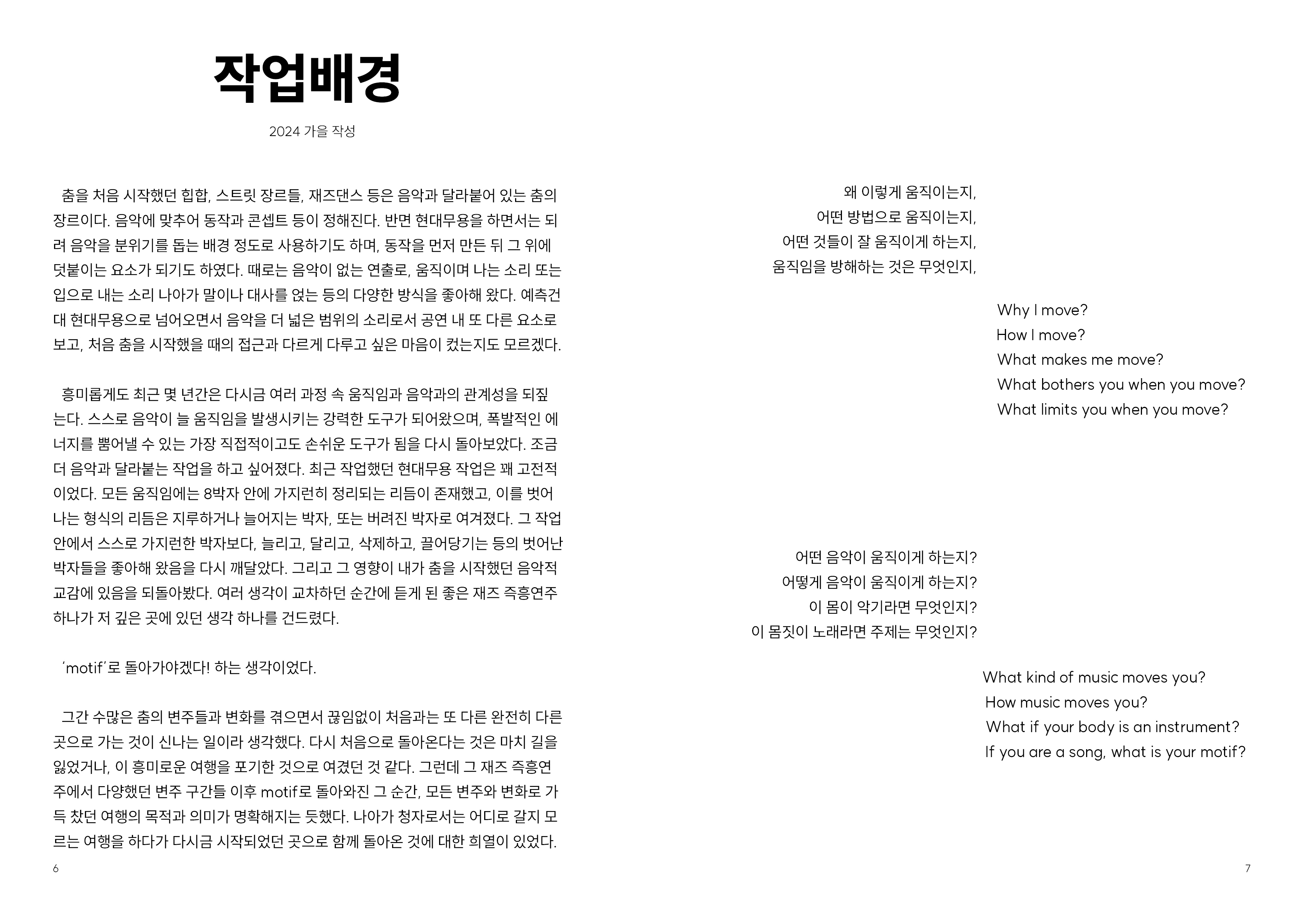 Living and traveling in several foreign countries with various cultures has allowed her develop her abilities while expanding her artistic perspectives. The primary theme of her work over the last 12 years has been focused on perception; particularly the limits of sight and understanding through the relationship of words and movements as well as the blurring of space and boundaries between spectator and performer. Works based on this theme have been presented since 2014; at the Korea National Contemporary Dance Company's 'CHOREO LAB', Asia Culture Center' 'Choreographer's LAB, PADAF, Ansan International Street Arts Festival and numerous projects and residencies; Ottawa Dance Directive- Ottawa (2021), Choreodrome-London(2018),K3-Hamburg(2017).