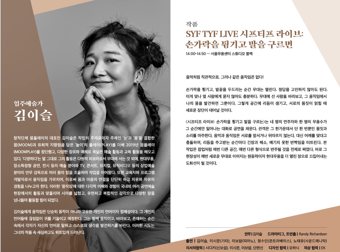 Living and traveling in several foreign countries with various cultures has allowed her develop her abilities while expanding her artistic perspectives. The primary theme of her work over the last 12 years has been focused on perception; particularly the limits of sight and understanding through the relationship of words and movements as well as the blurring of space and boundaries between spectator and performer. Works based on this theme have been presented since 2014; at the Korea National Contemporary Dance Company's 'CHOREO LAB', Asia Culture Center' 'Choreographer's LAB, PADAF, Ansan International Street Arts Festival and numerous projects and residencies; Ottawa Dance Directive- Ottawa (2021), Choreodrome-London(2018),K3-Hamburg(2017).